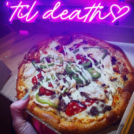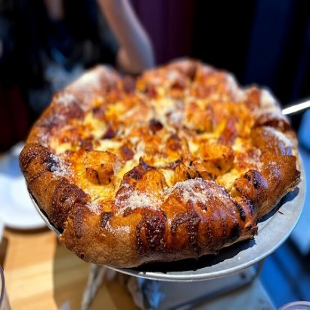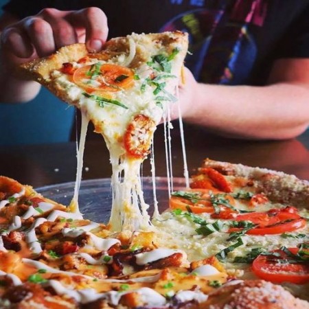 Shredded mozzarella topped with our signature BBQ chicken, sharp cheddar cheese, caramelized onions and applewood-smoked bacon. And to keep it funky, finished with a swirl of BBQ sauce.