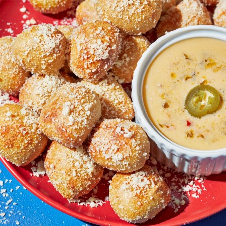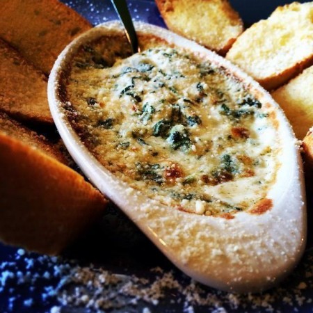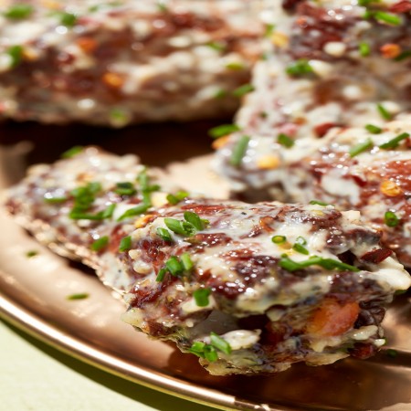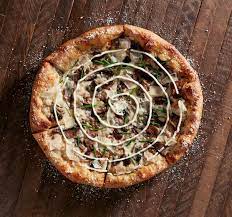 Made with mozzarella, then layered with Buffalo chicken, caramelized onions and applewood-smoked bacon. Finished with a double swirl of Buffalo sauce and your choice of chunky bleu cheese or ranch dressing.