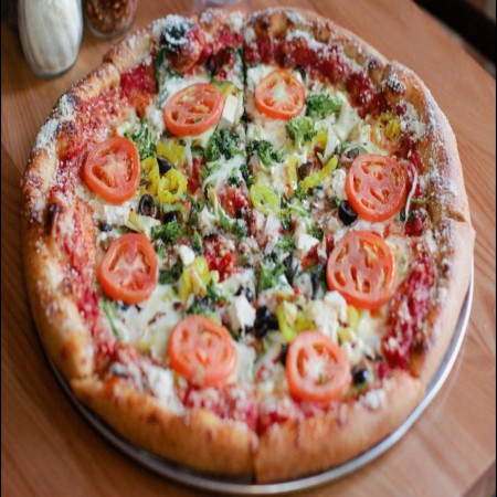 An olive oil and garlic base layered with mozzarella, provolone, seasoned ricotta, roasted tomatoes, crumbled authentic sheep’s milk feta cheese, fresh Roma tomatoes and sweet onions. Finished with chopped fresh basil.