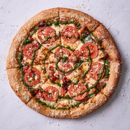 Filled with goodness, this pie starts with Mellow red sauce covered with spinach, roasted tomatoes, mozzarella, fresh Roma tomatoes and crumbled authentic sheep’s milk feta cheese. A hypnotic pesto swirl adds the finishing touch.