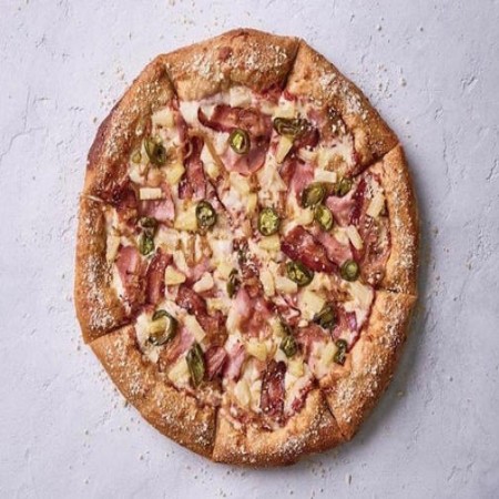 Aloha! Mellow red sauce topped with mozzarella, honey ham, applewood-smoked bacon, caramelized onions, pineapple and jalapeños add a final kick.