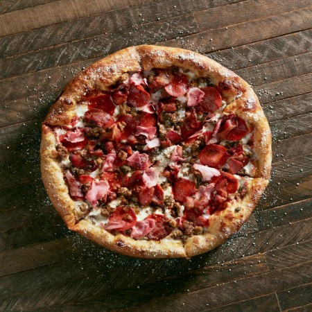 A carnivorous mix of pepperoni, Italian sausage, ground beef, honey ham and applewood-smoked bacon on top of Mellow red sauce and mozzarella.