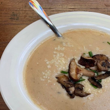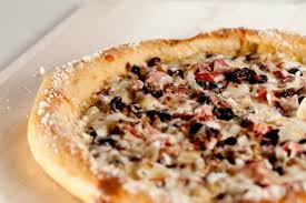 An olive oil and garlic base with roasted shiitake, button and portobello mushrooms, caramelized onions, mozzarella and creamy Wisconsin aged white cheddar cheese. Finished with fresh chives, shaved Parmesan, a garlic aioli swirl and a spritz of black truffle oil.