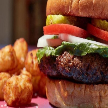 Smash Burger, all-natural black Angus beef, USDA-certified from family-owned and operated Harris Ranch. Served on a grilled brioche bun with a side of tater tots.